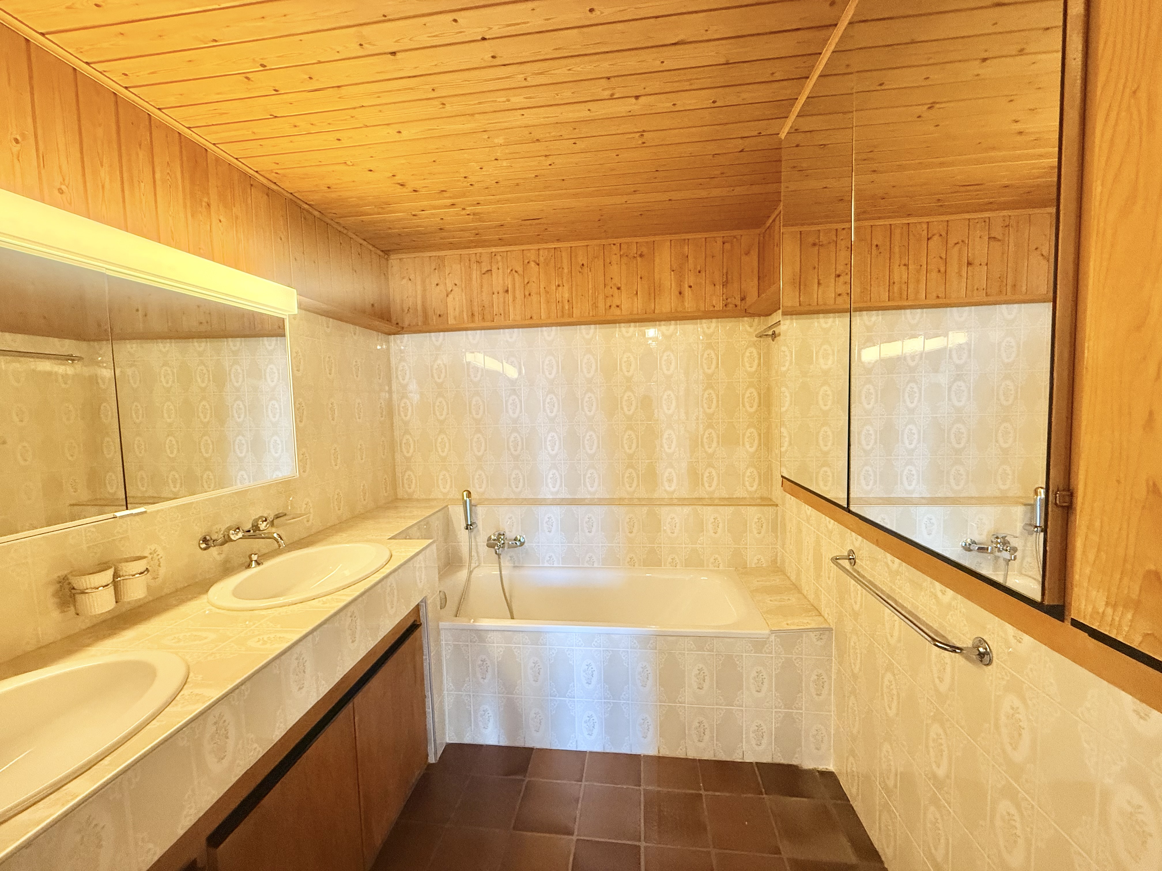 - une salle de bains avec baignoire, douche et double lavabo, avec armoires de rangement