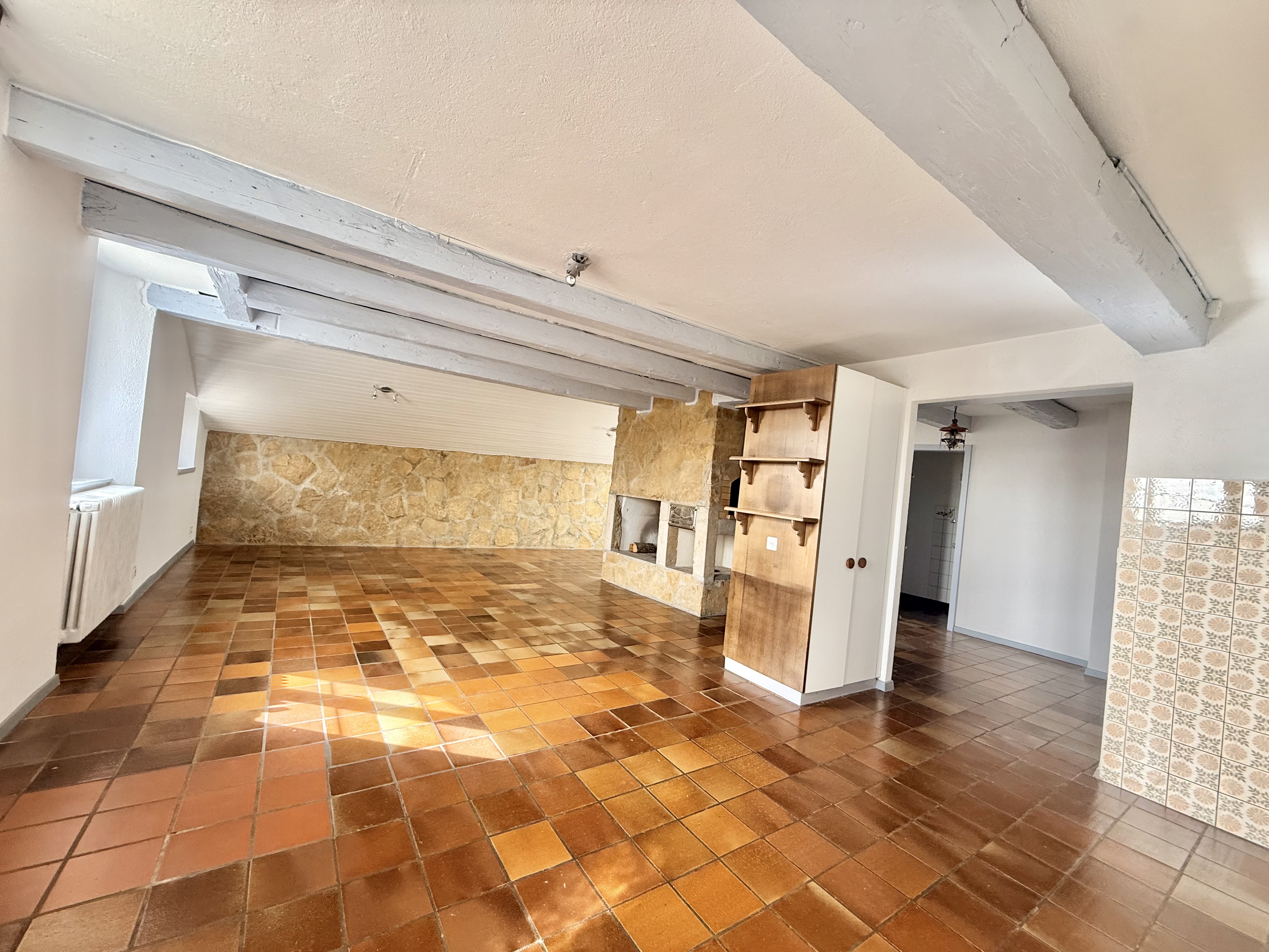 Le logement séduit par son cachet authentique, notamment grâce à sa cheminée en pierre naturelle et à ses murs en pierres apparentes. Le séjour est agrémenté d’un sol en carreaux de terre cuite, renforçant l’atmosphère conviviale du lieu.